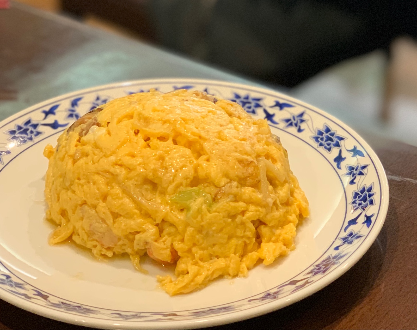 こんもりとお皿に盛られたカニ玉、いったい卵何個分なんだろ。