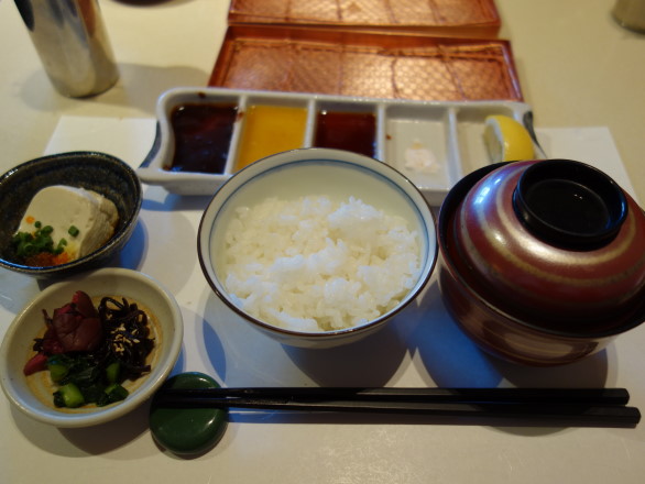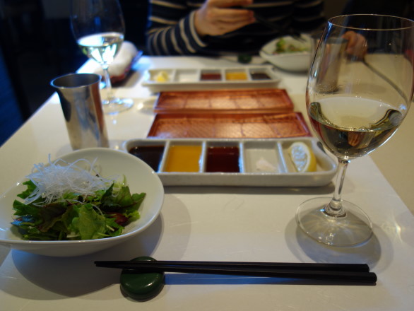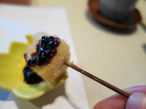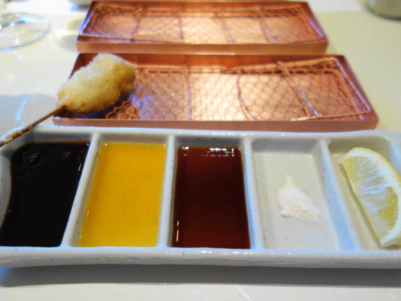 ブレンドソース、梅ソース、しょうゆ、塩、レモンが用意されておりまして、揚がった串は、こうしてそれぞれ合うソースの前に置いてくださるそうよ。