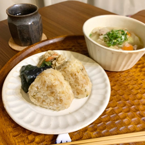 【楽天お取り寄せグルメ】悪魔的おいしさのたぬきおにぎりとDEAN&DELUCAも!な楽天SSお買得品 最近、夜は軽めを心がけておりまして、この日も慎ましくおにぎりと豚汁。土井先生も一汁一菜を推奨されているし。お味噌代わりに薬膳スープを使ってます。 食器はこちら 2022年03月09日