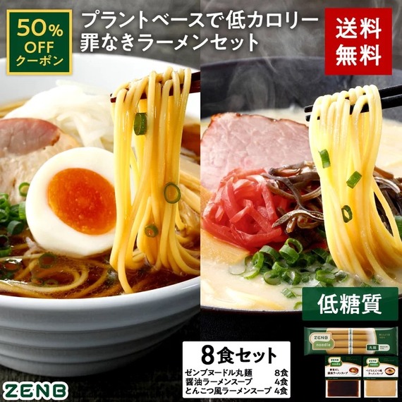 低カロリーで低糖質!黄えんどう豆のヘルシー麺「ZENBヌードル」が半額セール中! 黄えんどう豆100%で作られた糖質オフのヘルシー麺「ZENBヌードル」。フードロス削減価格の対象商品50%OFFクーポンが配布中!対象商品はこちらの2点! 【フードロス削減企画★50%OFFクーポン】【セット品】ZENB ゼンブ ヌードル 丸麺 ラーメン スープ 2種8食セット ( 醤 2023年10月06日