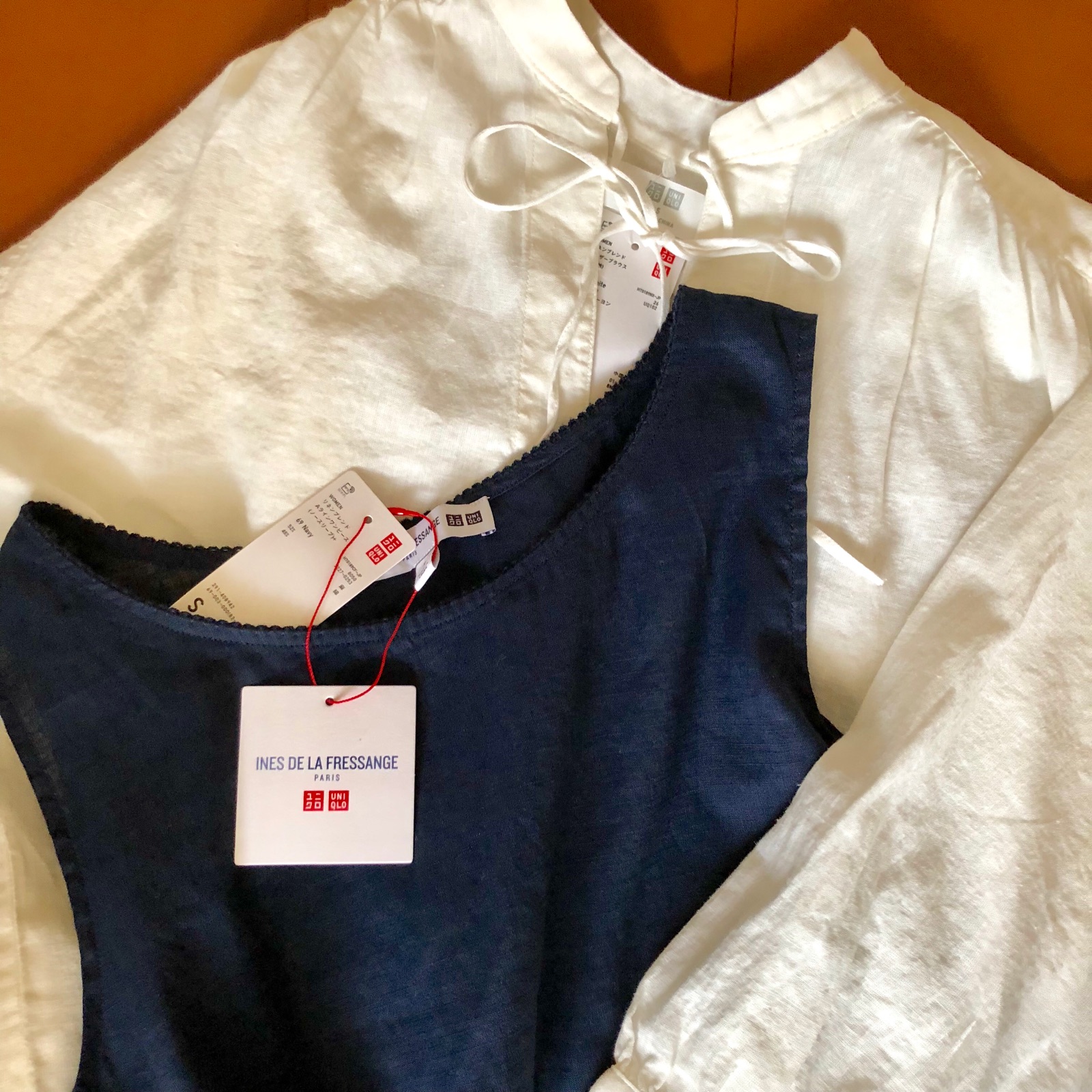「1500円になるんだよ!」と、無理やり羊ちゃんにも1着買わせてお得プライスにしたリネンブレンドのブラウスとイネスのワンピース。