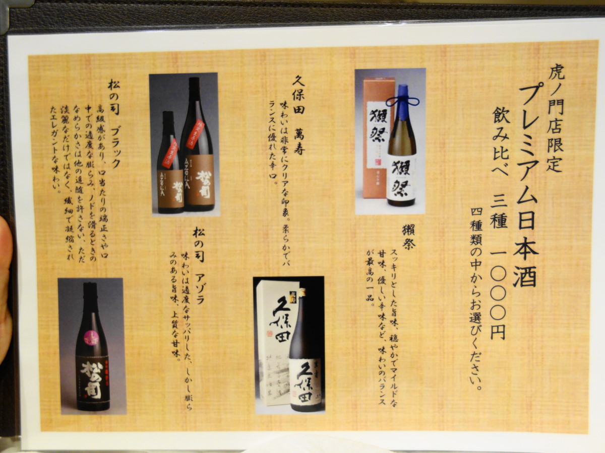 虎ノ門店限定のプレミアム日本酒飲み比べ三種@1000をいただきます。
