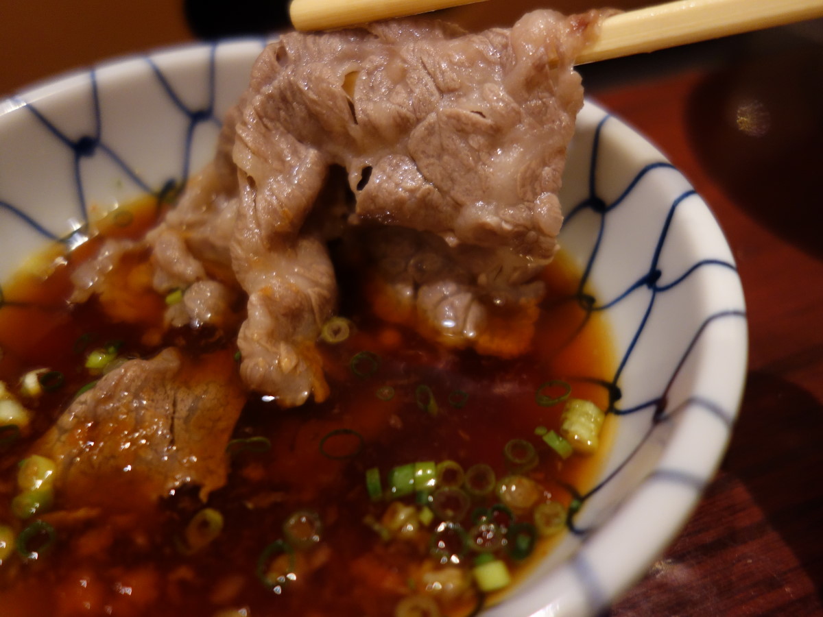 鍋に豚肉を入れて、ちりちりっとなったぐらいの状態で引き揚げ、つゆにつけていただきます。