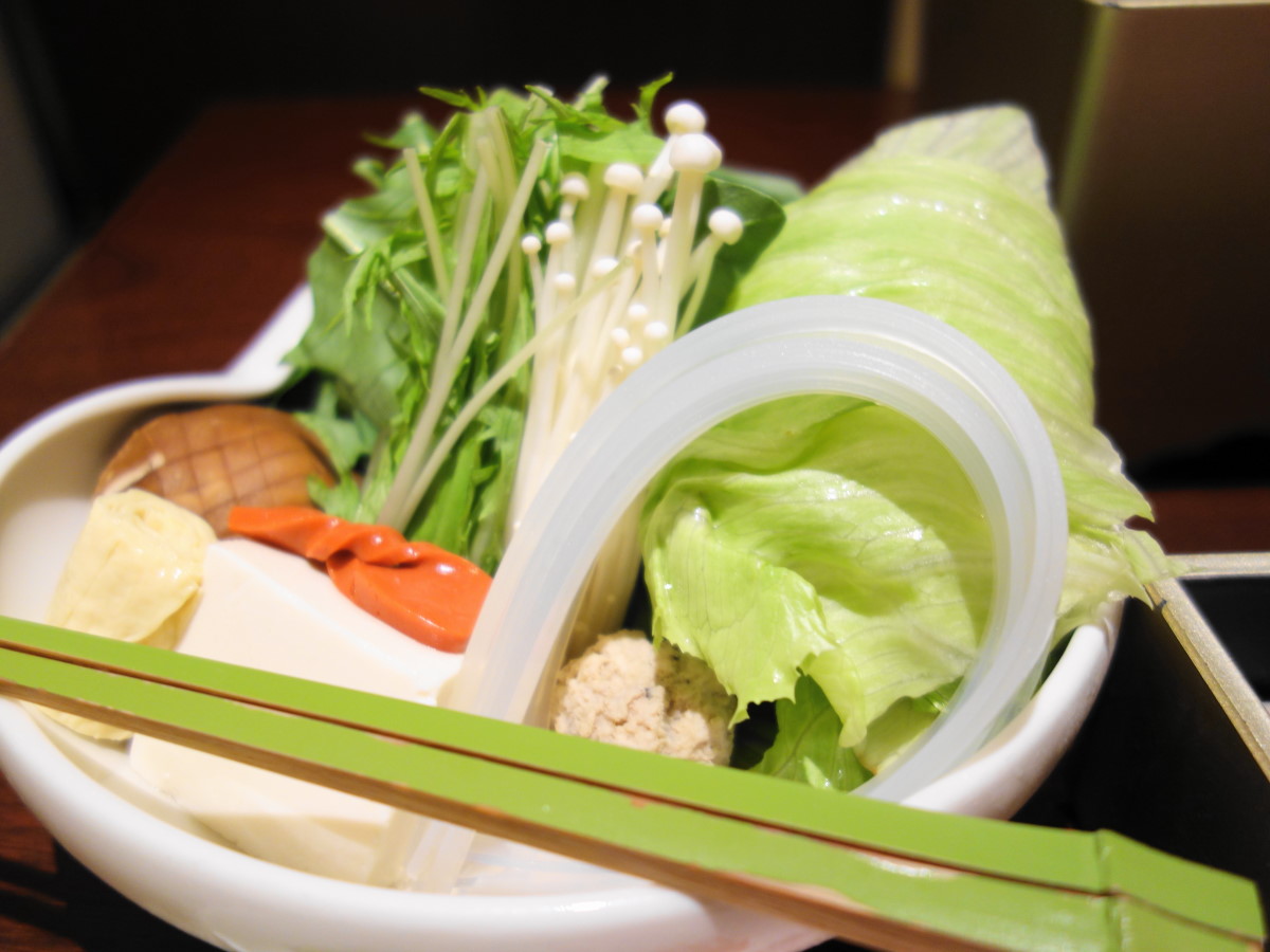 お野菜盛り合わせは、種類豊富な野菜に近江の赤こんにゃく、京都の比叡湯葉、豚肉団子などが盛り合わせになっております。