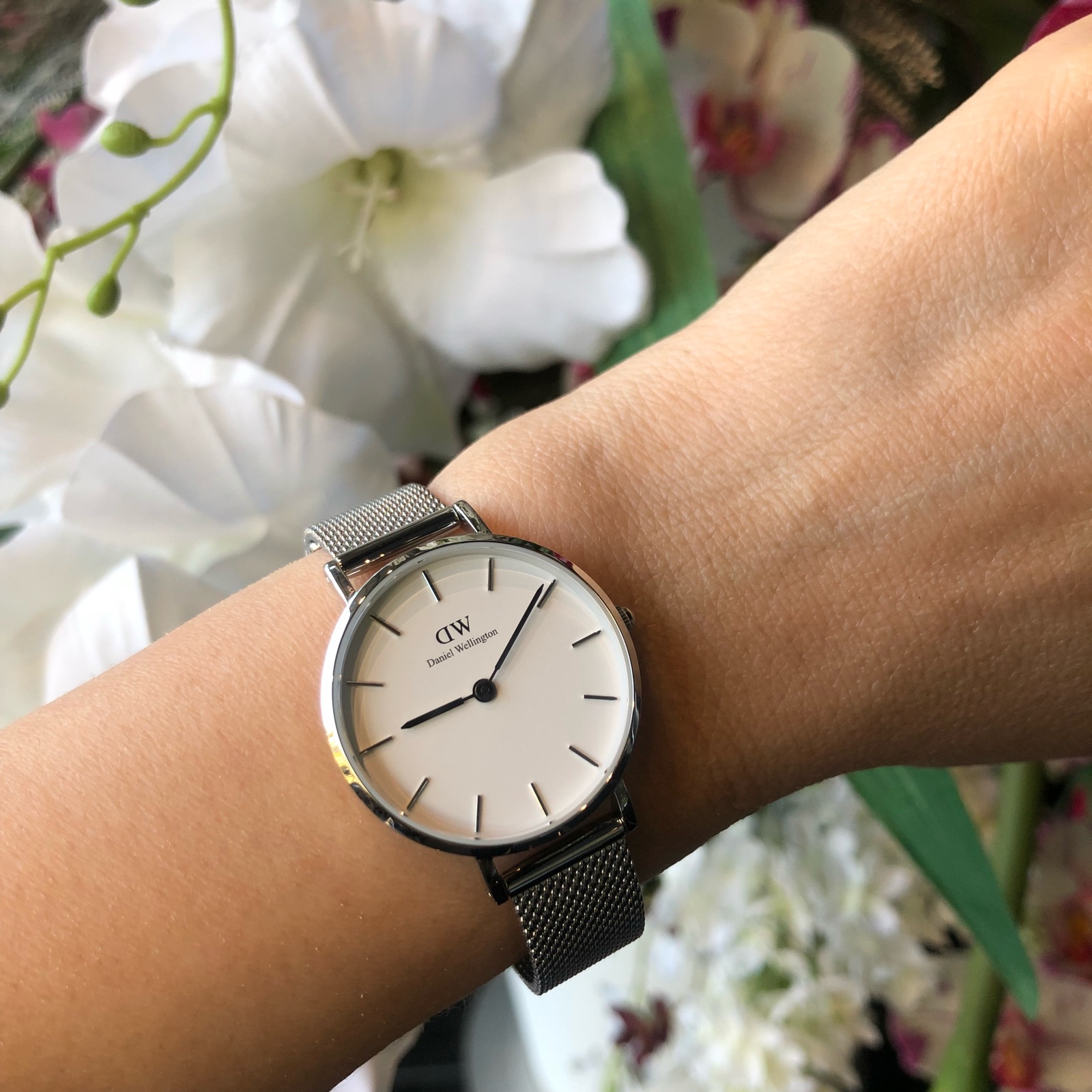 腕時計は、メッシュタイプストラップのCLASSIC PETITE STERLING 28MM。