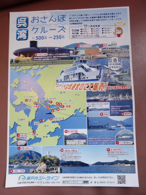 おさんぽクルーズは観覧船ではなく、普通に運行している呉港~江田島小用港の船に乗せてもらうので、特に説明はナシ。