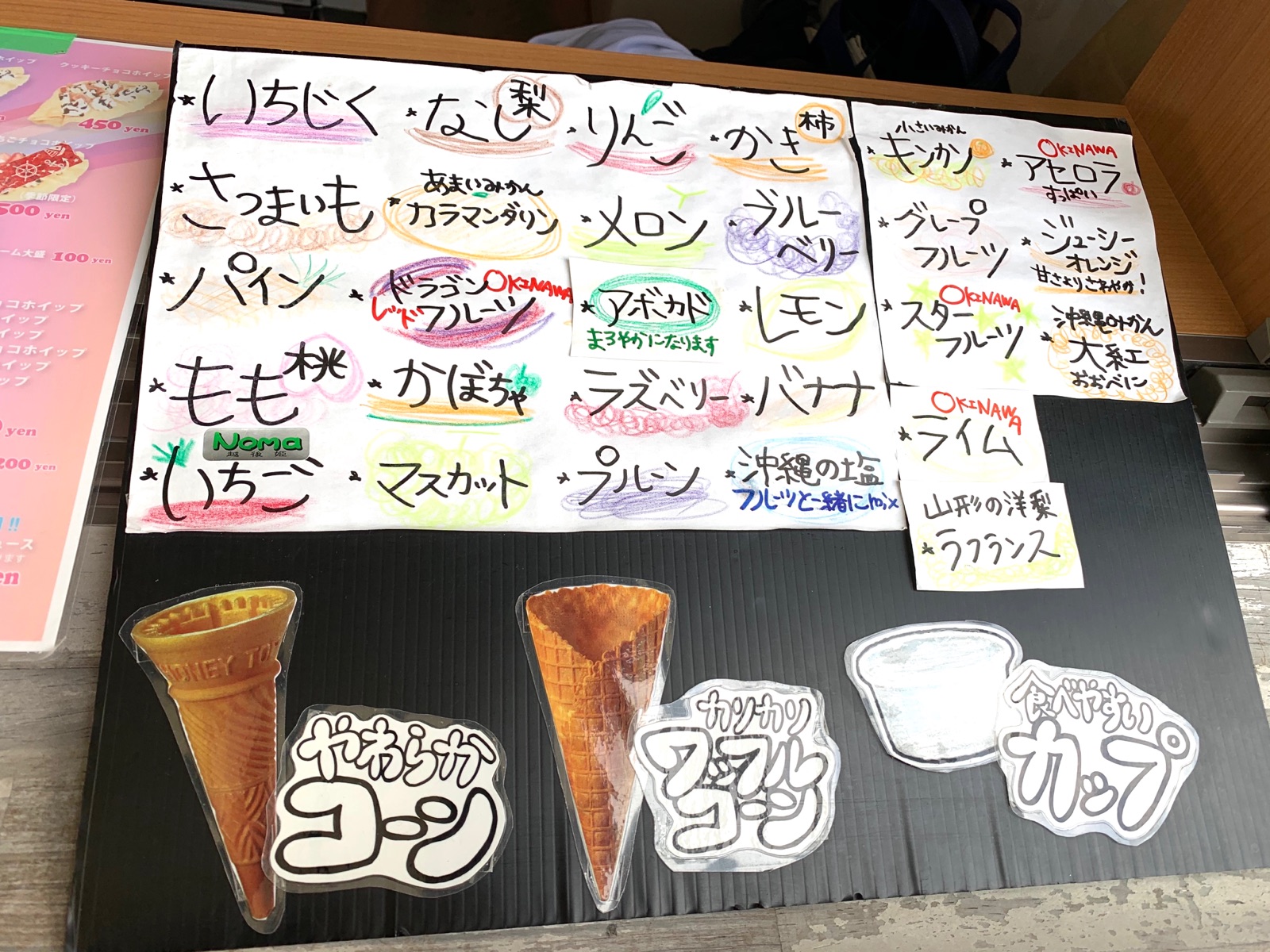 こちらのお店では、バニラかヨーグルトのソフトクリームに30種類近くのフルーツの中から好みのフルーツを3種類選んでブレンドしてもらえます。