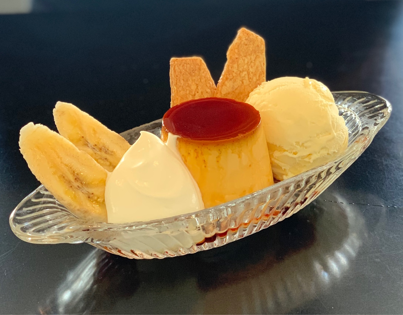 プリン、アイス、サブレ、バナナ、ゆるめのクリーム。