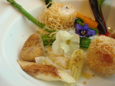 天使のエビのカダイフ巻き リードボーと旬の野菜のパナシェ レモンバームソース
