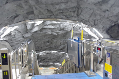 地下へのエスカレータ天井が洞窟みたいになっていて、