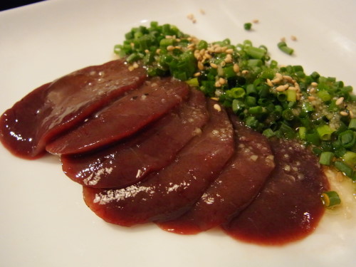 と、出てきたレバ刺し、エッジの鋭さとか皆無な上に色も鮮やかではなくて