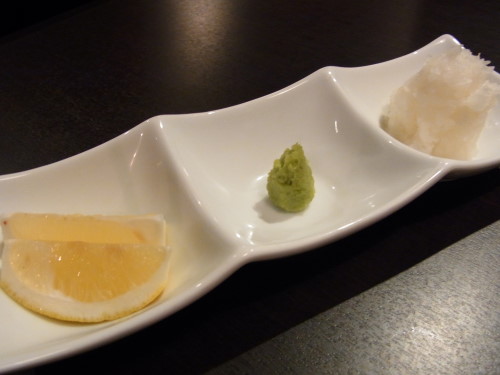 薬味はレモン、ワサビ、大根おろし。
