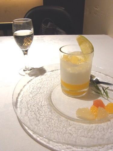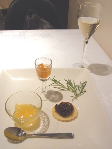 1皿目 オレンジゼリー、いちじくのディップ、プラムのスープ
