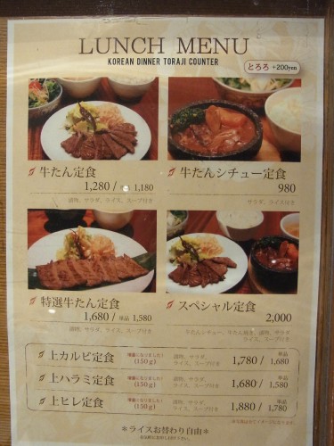 ランチメニューには牛タン定食などもあって、他のトラジとはちょっと違うラインナップ。