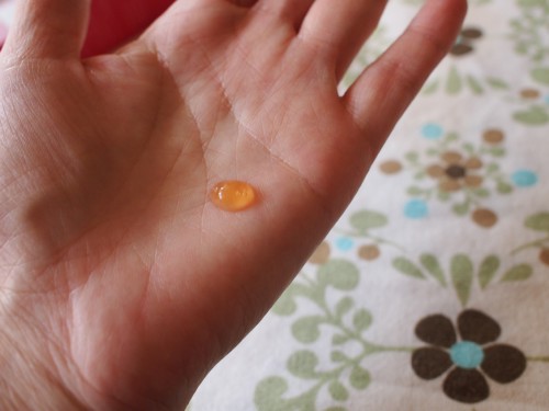 化粧水の後、プッシュして手に取ると、オレンジ色がかったとろみのある液体。