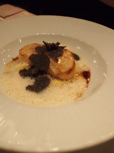 ホタテのソテー トリュフのマッシュポテトとベーコンのカプチーノ