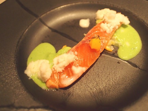 サーモンのミキュイ 新玉ねぎのグラニテ ソラマメのピューレ