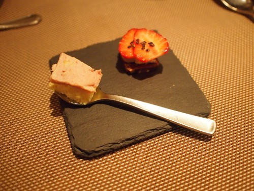 そして、アミューズ その3 フォアグラとチーズスフレ&イチゴとココアサブレ
