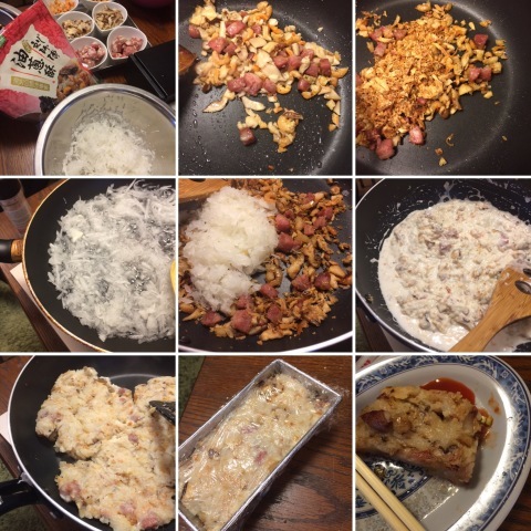 材量は干しえび、しいたけ、腸詰、フライドエシャロットに大根とつなぎの粉類。