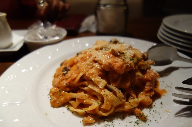 パスタも頼んでおこう!と、キノコと生ハムのトマトクリームソース。