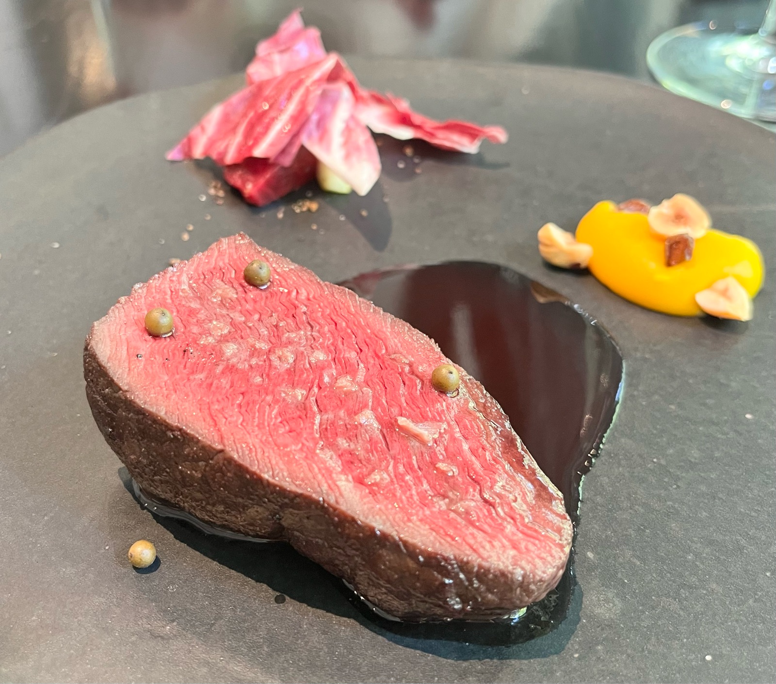 蝦夷鹿シンタマの稲藁焼き、ジェニパーベリー香る赤ワインソース