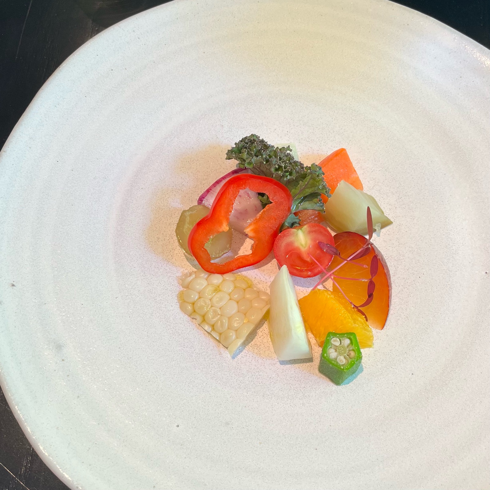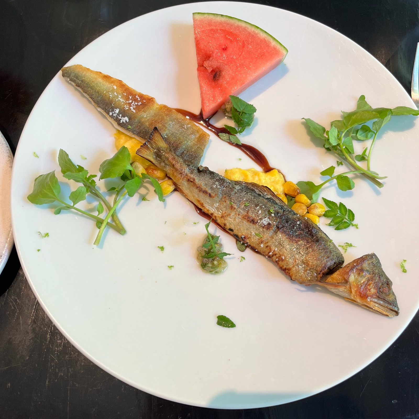 うるかのガストリック、サルサヴェルデ、焼きトウモロコシ、山椒、すいか。