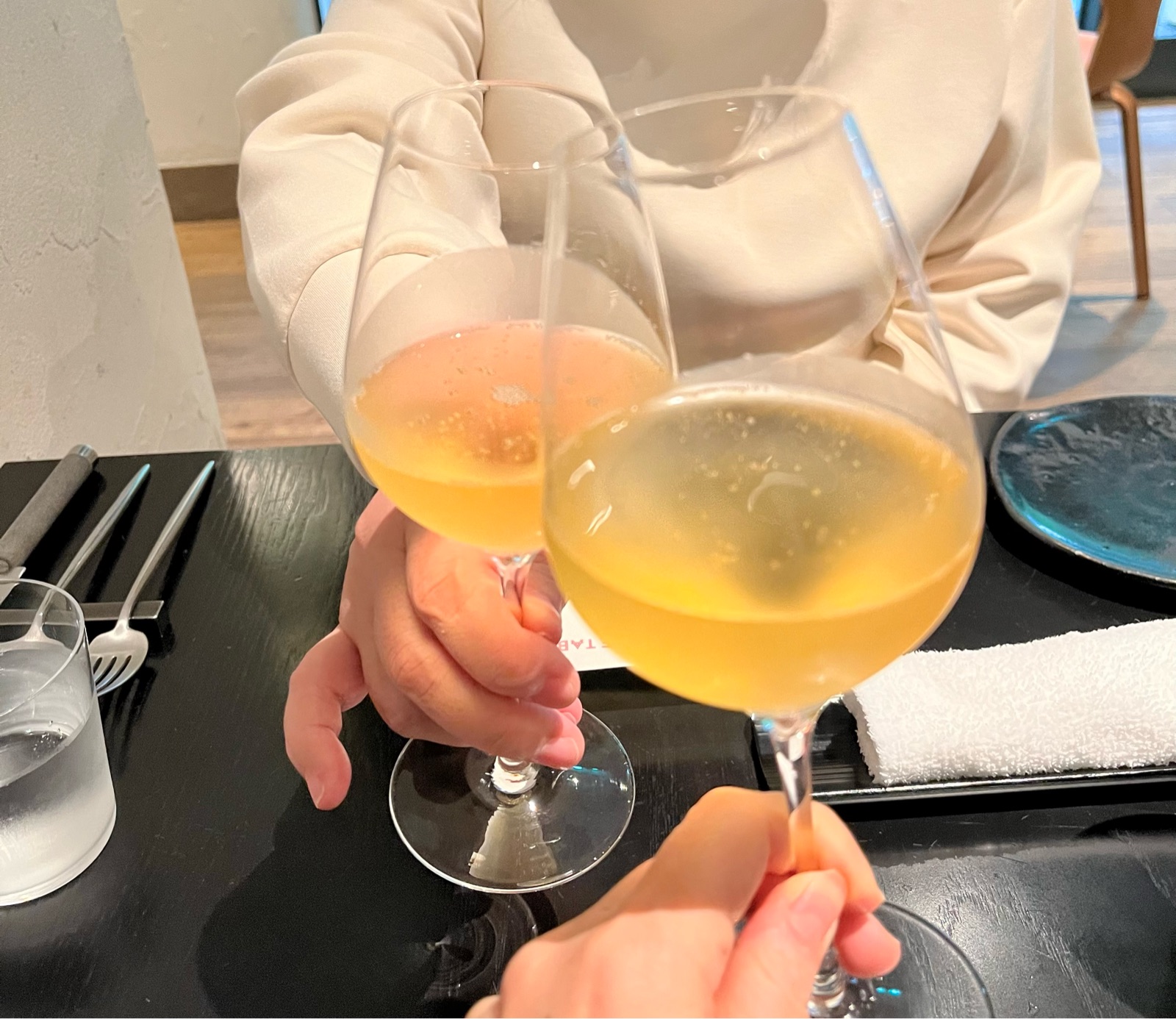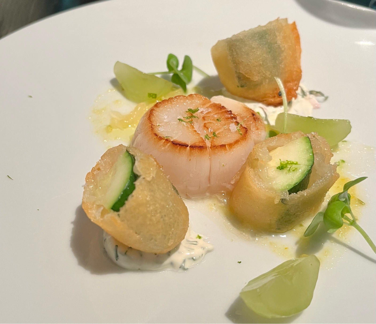 前菜はホタテのポワレ ズッキーニのベニエ、