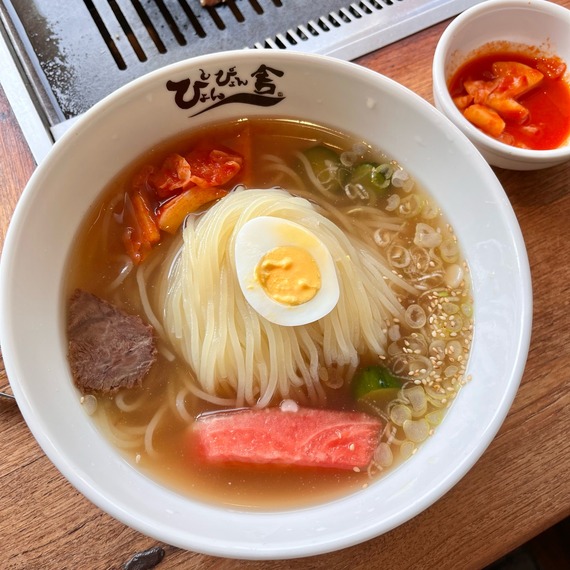 ぴょんぴょん舎で焼肉と冷麺のよくばりランチ 先週、平日休みを取っったので銀座のぴょんぴょん舎でのんびりランチ。かなり広い店内にもかかわらず13時過ぎでも満席で少し待って入店。昼も夜も人気なのね。窓際のカウンター席にご案内。このぐらいゆったりとしたカウンターだと焼肉も焼きやすいよね。あれ?スープと焼肉 2025年09月01日